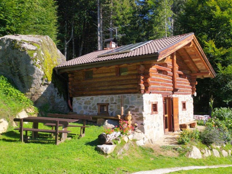 Die original Trentiner Almhütte, errichtet aus örtlichen Natursteinen und Massivholz, liegt im Naturpark Adamello - Brenta auf 1290 Metern in sonniger Hochgebirgslage an den Westhängen der Adamellogruppe auf einer Almwiese mit überwältigendem Blick auf die umliegenden Alpen und die bizarren Brentadolomiten hoch über dem Rendenatal.